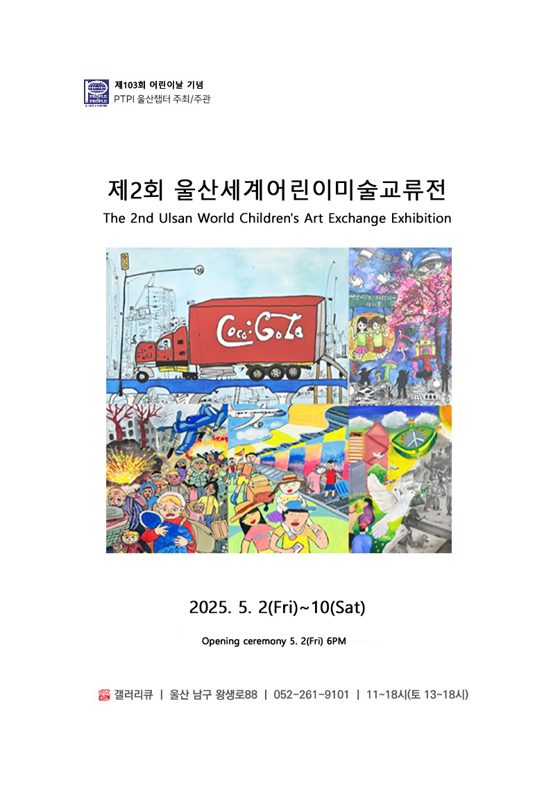 이번 전시는 울산 왕생이길에 위치한 ‘갤러리 큐’에서 5월 1일부터 10일까지 열리며, 개막식 및 시상식은 5월 2일 오후 6시에 개최될 예정이다. PTPI 울산챕터는 이번 행사를 통해 세계 어린이들이 예술로 소통하고 평화의 가치를 함께 나누는 뜻깊은 시간이 되기를 기대하고 있다.